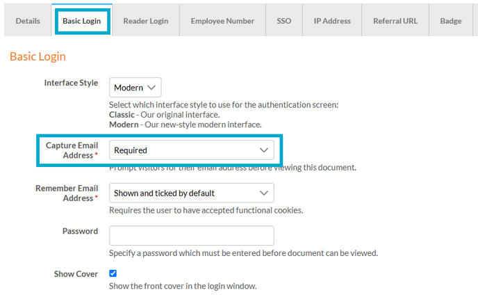 - Select the 'Show Cover' checkbox to display a thumbnail of the document cover on the login screen.