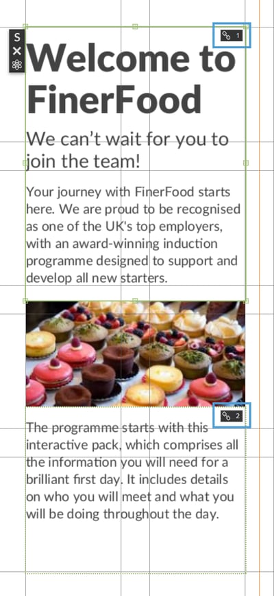 Tom is redesigning the New Starter pack and wants to make the welcome message more engaging by adding some imagery. He adds a Story panel with the welcome message, followed by an Image panel. He then adds a second Story panel so the Body text from the first flows into it.