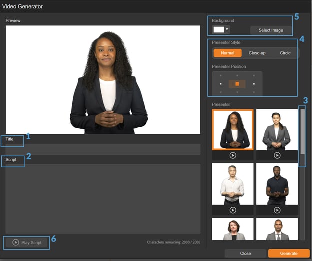A selection of presenters (or ‘avatars’) are available when you use the Video Generator to create video.