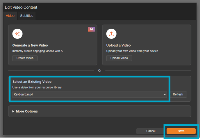 Select the required video file from the ‘Select an Existing Video’ drop-down list.