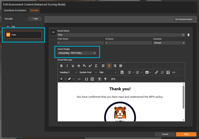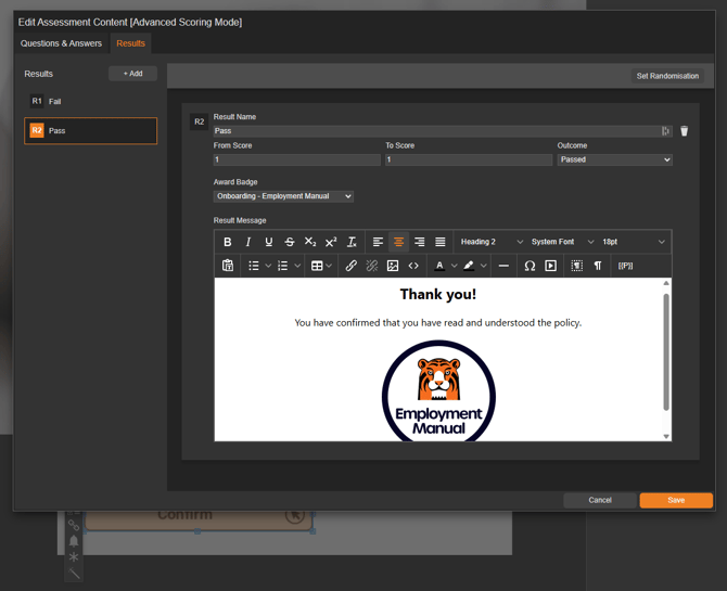 Each document you create must contain an Assessment module that awards a Badge to the user. This is a key requirement for how courses function, as you will need to specify which Badges a user needs to earn to complete it.