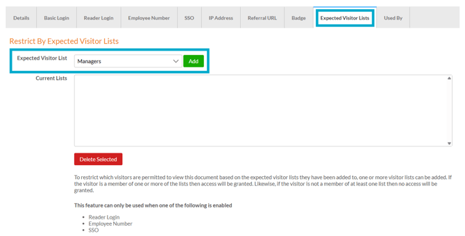 Secure your content with precision by combining an Expected Visitor List (EVL) with a Reader Login, SSO or Employee Number security rule. When a user logs in, their email address will be compared to the EVL - those included will be allowed to view the document, any anyone not on the list will be denied access.