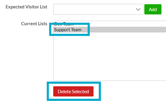 If you need to delete an Expected Visitor List from a Security Rule, select it from the 'Current List's field, followed by the 'Delete Selected' button.