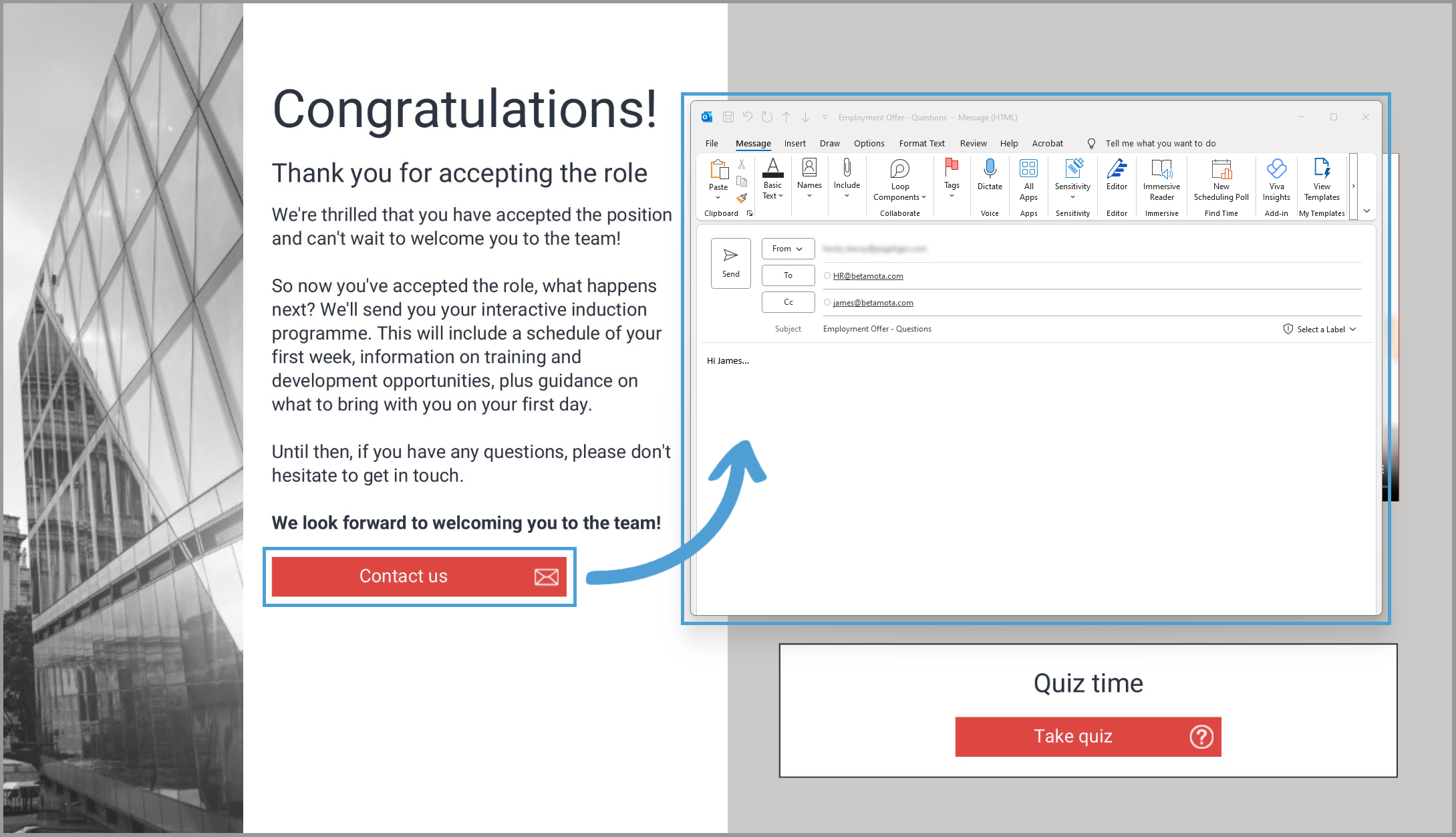 HR have sent a Employment Offer pack to Lisa and welcome any questions ahead of her start date. They have added a Send an Email module to the pack so she can send an email containing any questions she may have.