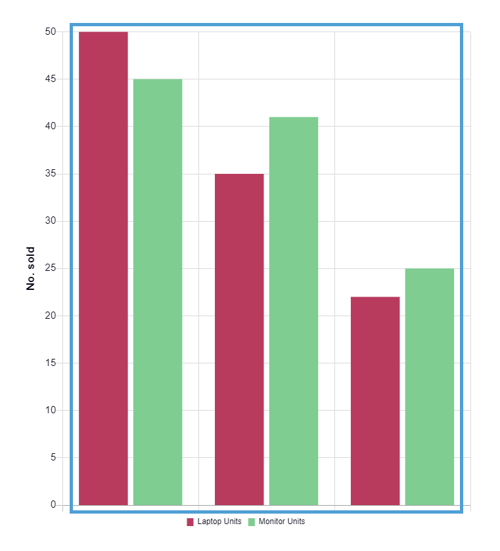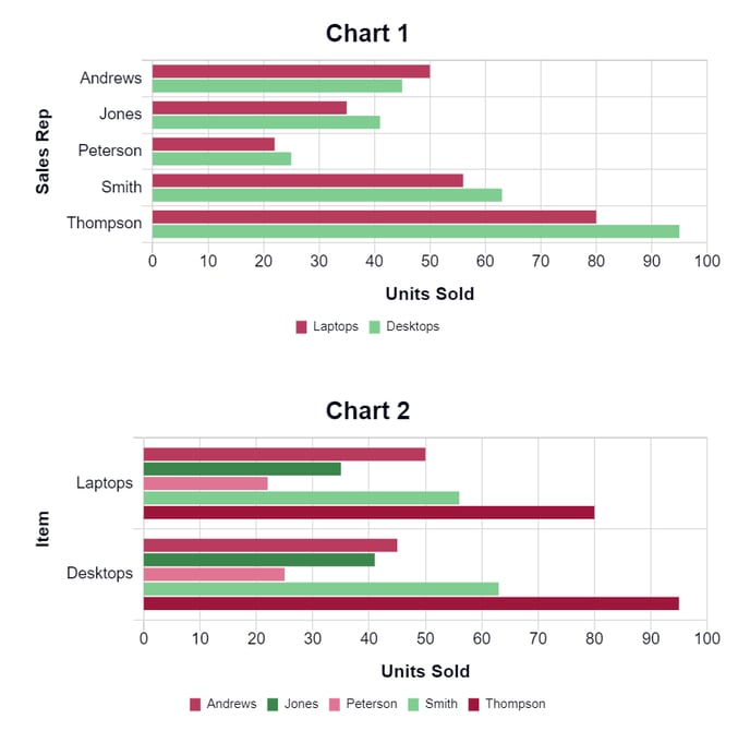 Chart 1 displays the sales reps in rows (the y-axis) and the type of item in the columns. When the 'Switch Rows with Columns' option is selected (Chart 2), this will swap, displaying the type of item in rows (the y-axis) and the sales rep as their own column.