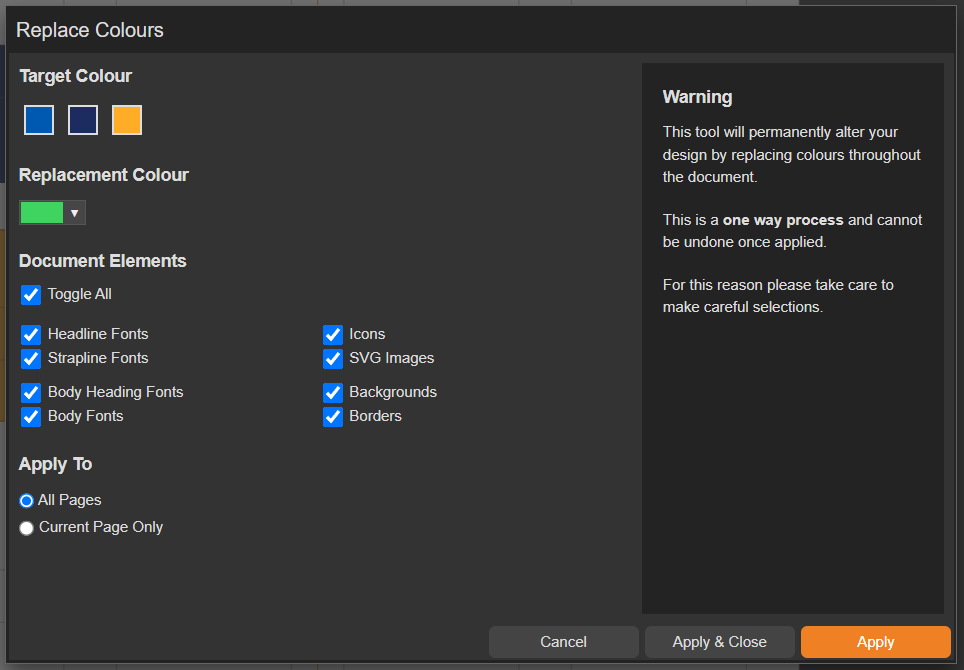 This tool will permanently alter your design by replacing colours throughout the documents - please take care when making your selections, as this is a one way process and cannot be undone once applied.