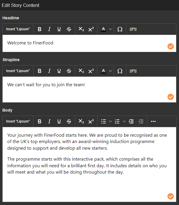 A Story panel is similar to a Text panel, but can be used for optimised articles, as three sections are available; Headline, Strapline and Body. Each section will be included by default, but can be changed using the 'Include?' checkbox- for example, you may wish to only include Headline and Body text.