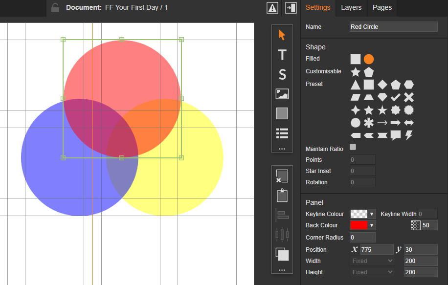 The 'Name' field is set default, but it's important to update it to something unique that reflects the content - for example, 'Red Circle'. Descriptive names make it easier to identify the panels in your design, which is particularly helpful if you're using lots of the same panel type.