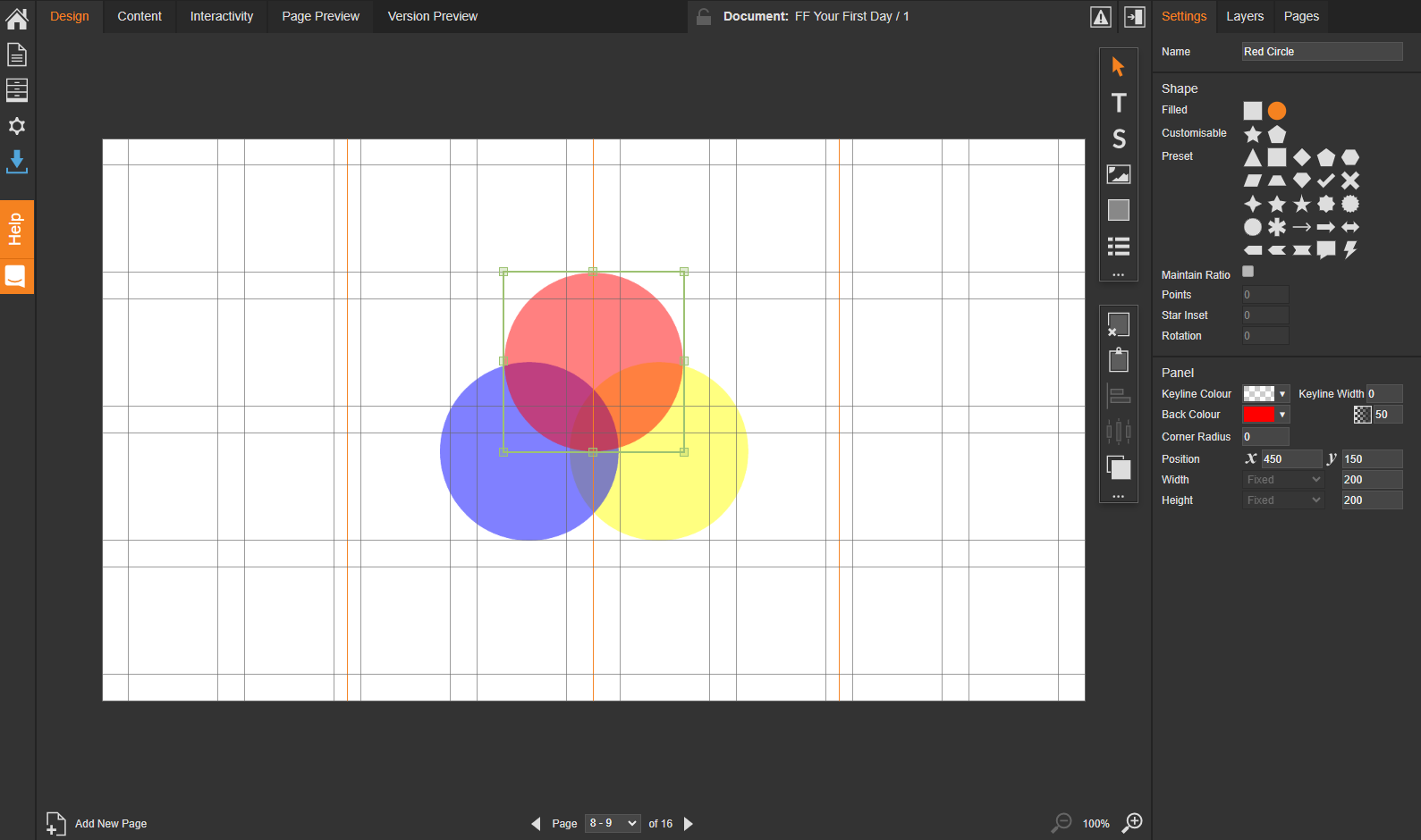 When a panel is selected, the Settings palette will become active ready for you to choose settings, such as the shape type and colour. There are 3 main sections in this area, Name, Shape and Panel.