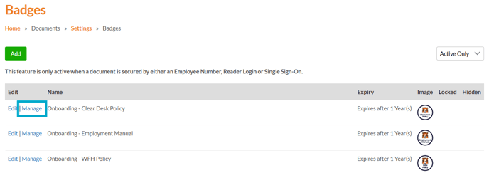 The 'Manage' option is also available on the 'Awarded To' tab for a badge.